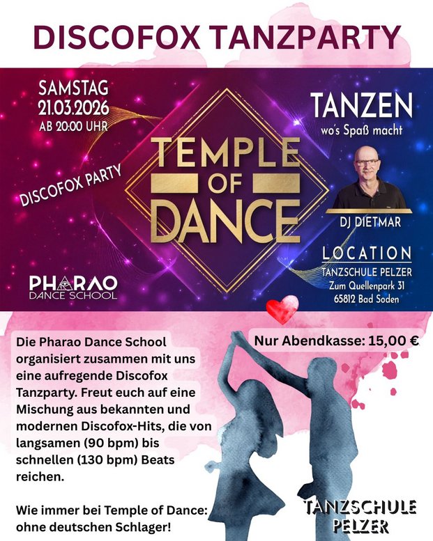 Einlass 13:30 Uhr, getanzt wird von 13:45 bis 14:45 Uhr. Kosten: 10,00€ pro Person/Termin.