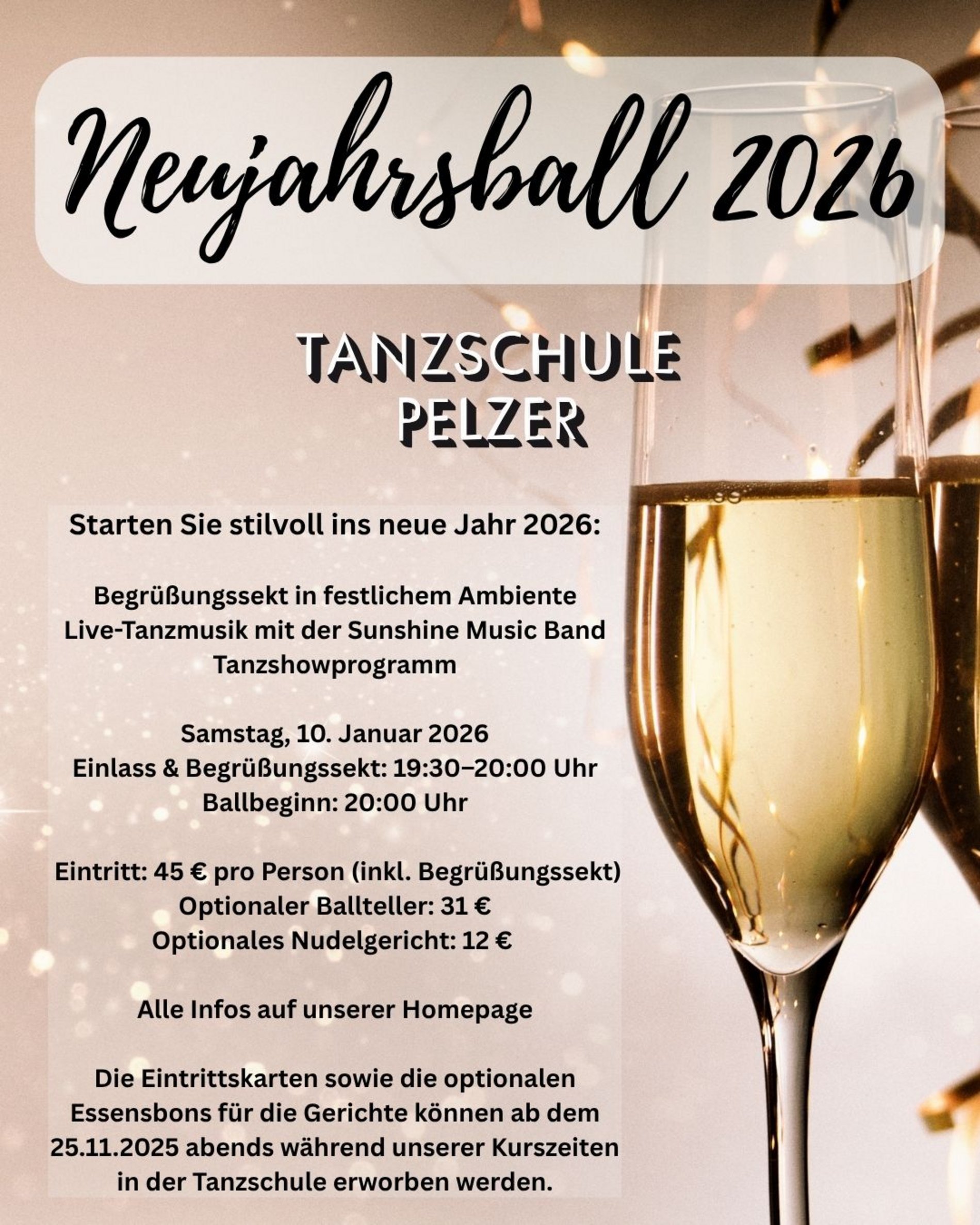 Die Eintrittskarten sowie die optionalen Essensbons für die Gerichte können ab dem 25.11.2025 abends während unserer Kurszeiten in der Tanzschule erworben werden.