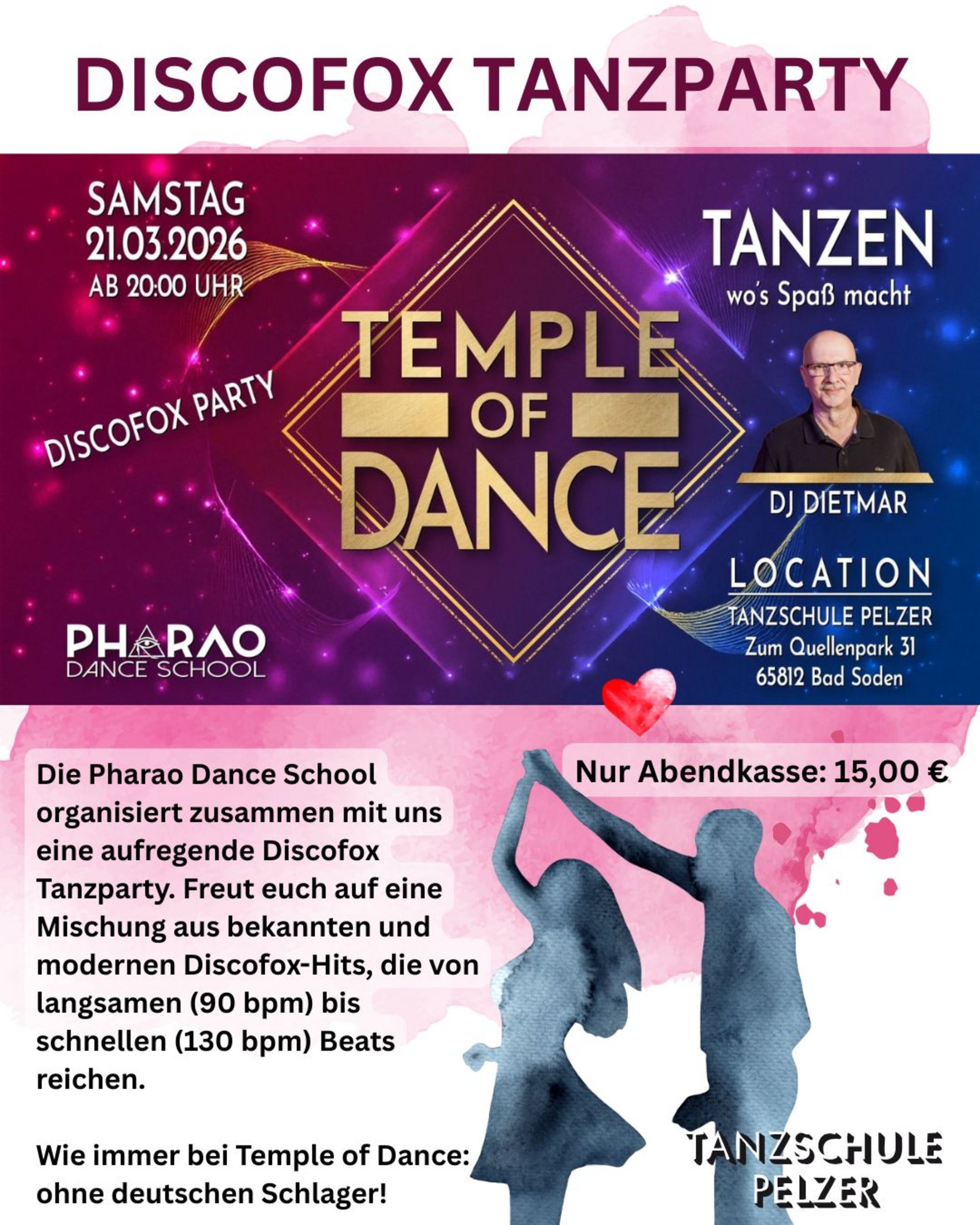 Die Pharao Dance School organisiert zusammen mit uns wieder eine aufregende Discofox Tanzparty.